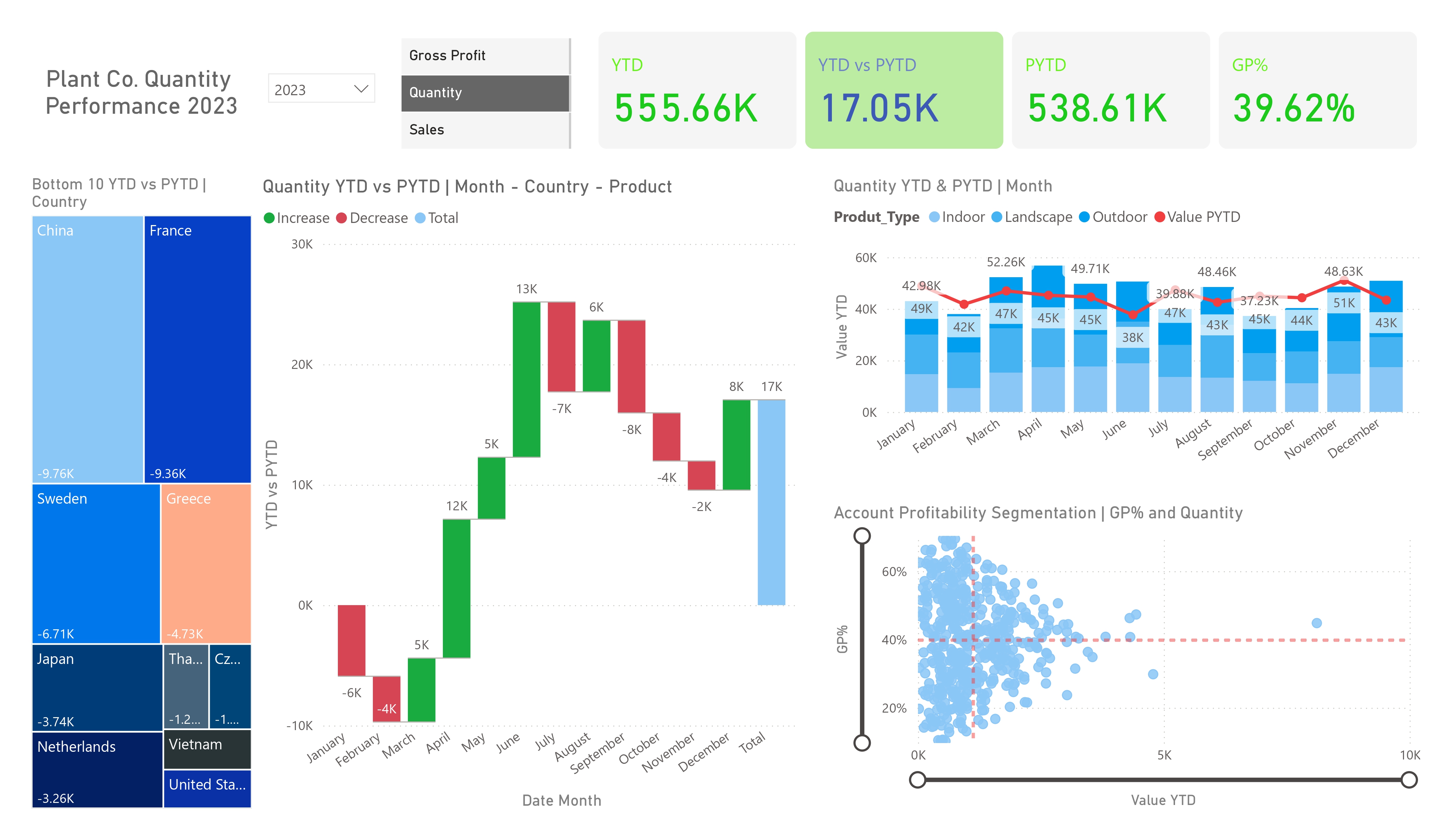 Designed an interactive dashboard using Switch Measures and Conditional Formatting to analyze YTD vs PYTD Sales, Quantity, and Gross Profit %. The report highlights key business pain points and growth opportunities with clear visual storytelling.
