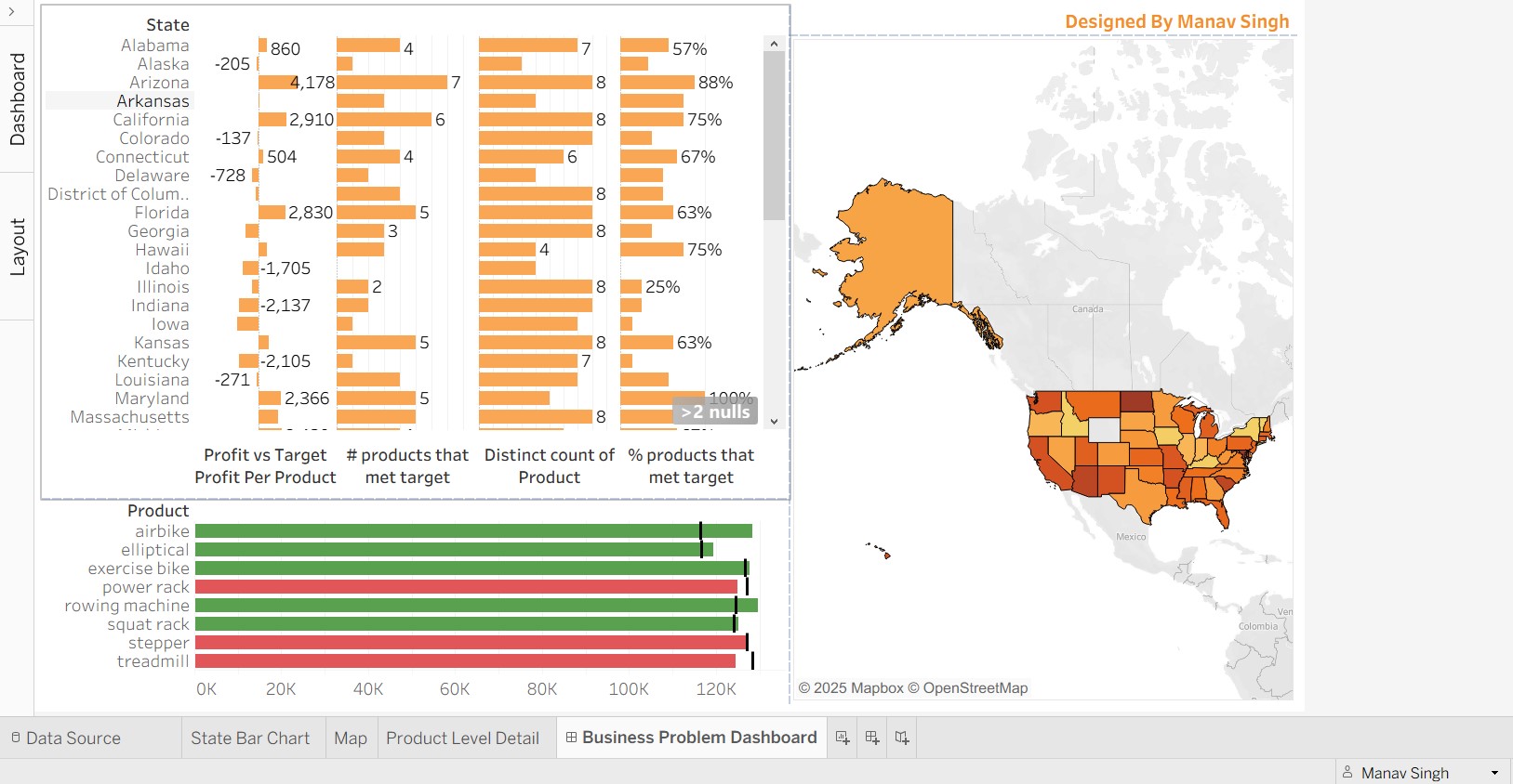 📊 Business Problem Dashboard An interactive Tableau dashboard designed to compare actual vs. target performance across key business metrics. The project highlights performance gaps, supports KPI tracking, and delivers actionable insights for better decision-making.